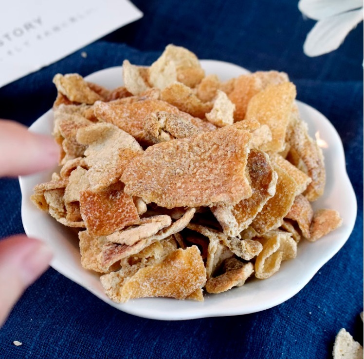 陳皮味辛性溫,有理氣作用,治療胸中不適、降逆止咳止嘔,亦有健脾作用,可開胃增食慾、去除口臭,令胃腸之氣向下行而通便,更有助孕婦解除乳房脹痛.